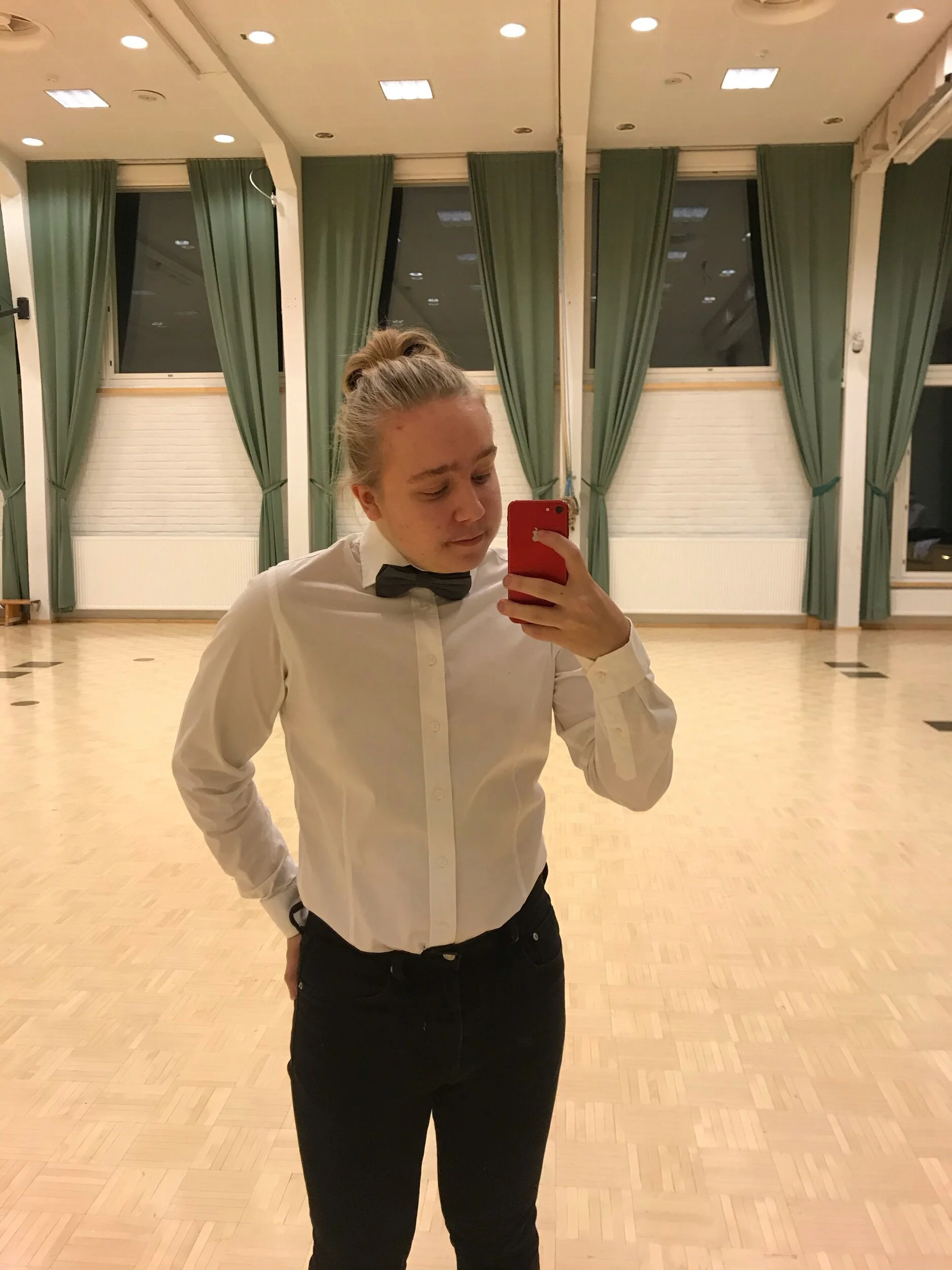 Puvustuksen kanssa meillä kuitenkin oli huomattavasti ongelmia: Laitetaan kauluspaidat, minkä väriset, ”ei oo sitä ja ei oo sitä.” Farkut vai puvun housut. ”Ei oo mustia farkkuja” ”MITEN EPALLA EI OO MUSTIA FARKKUJA” no laitetaan sit puvun housut ”MITEN EPALLA EI OO MUSTIA PUVUN HOUSUJA” Pistetäänkö rusetit, no minkäväriset, no onko mustia, no onko?